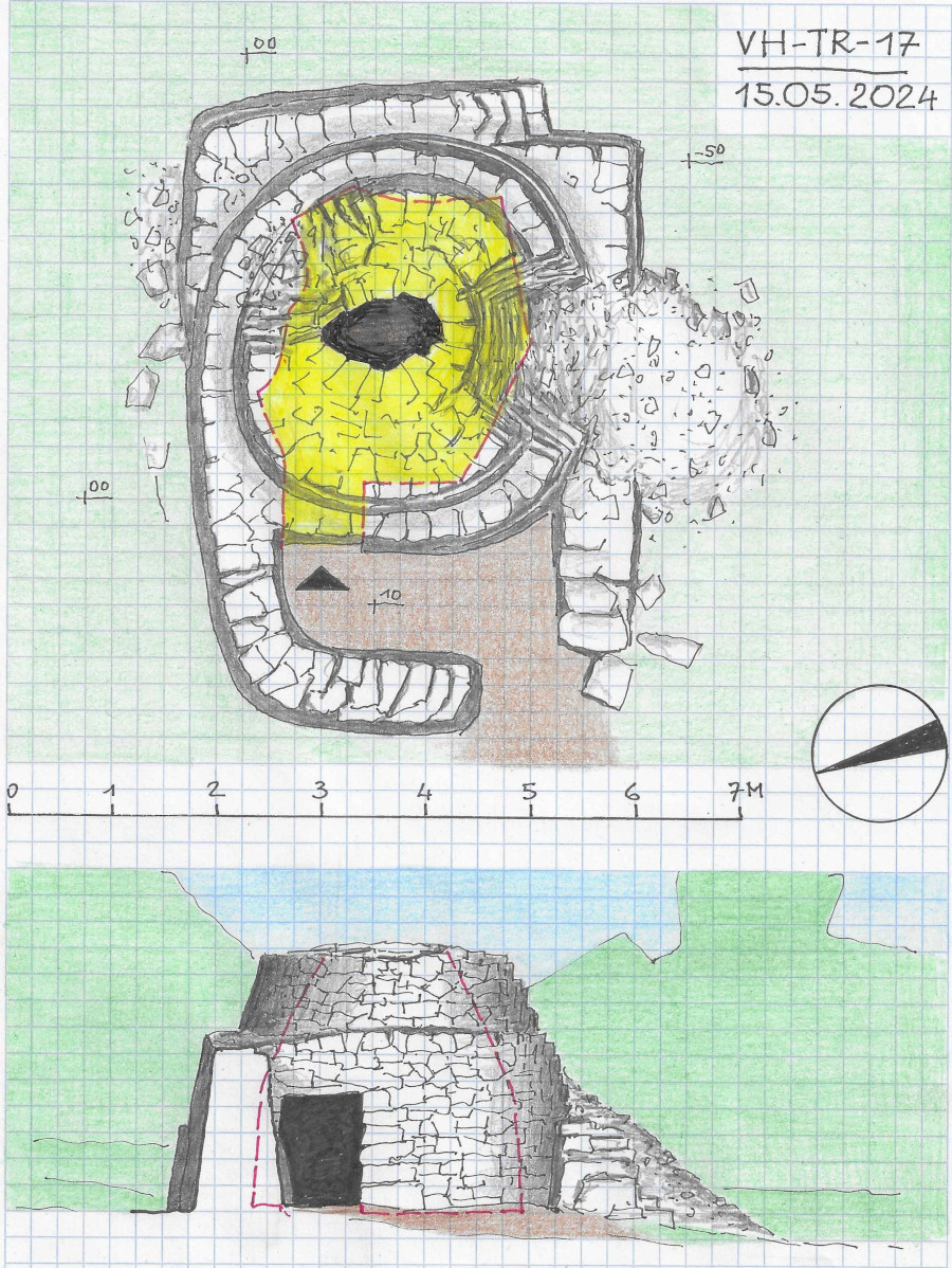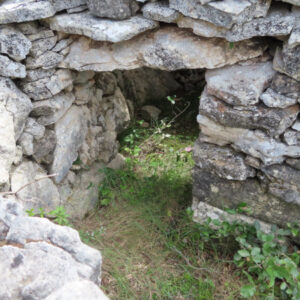 Eingang und Vorderseite werden durch eine Steinmauer geschützt. Der Eingang war verwachsen. Die linke Seite des unregelmäßigen Innenraums wird von Naturfels bestimmt. Der Trim wird nicht mehr genutzt.